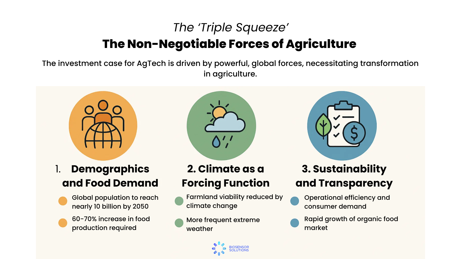 This "Triple Squeeze" makes incremental improvements to our current agricultural paradigm insufficient. It creates an inelastic and permanent demand for the efficiency, resilience, and systemic transformation that only technology can deliver.